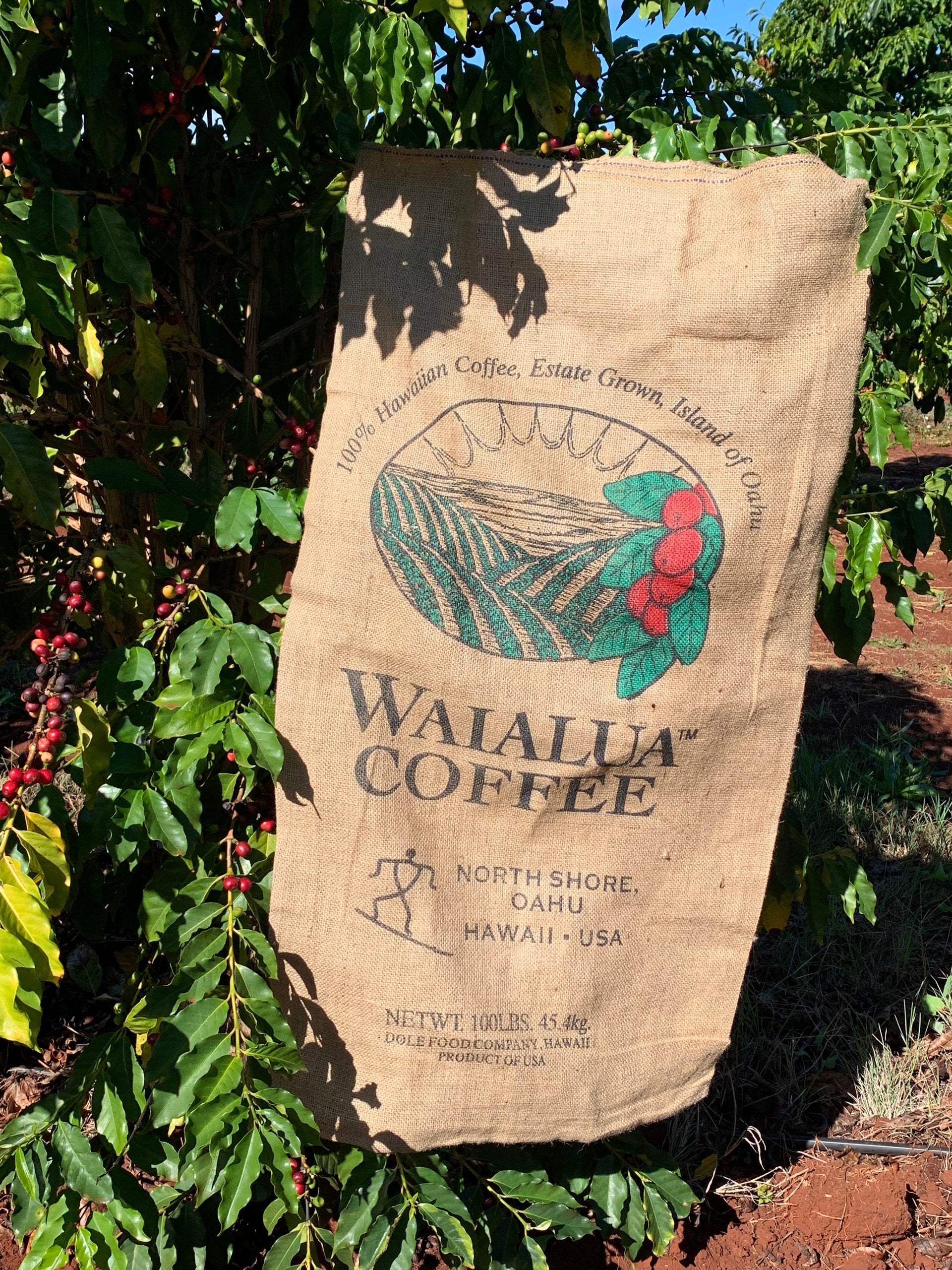 Authentic Waialua Coffee burlap bag used for coffee beans.